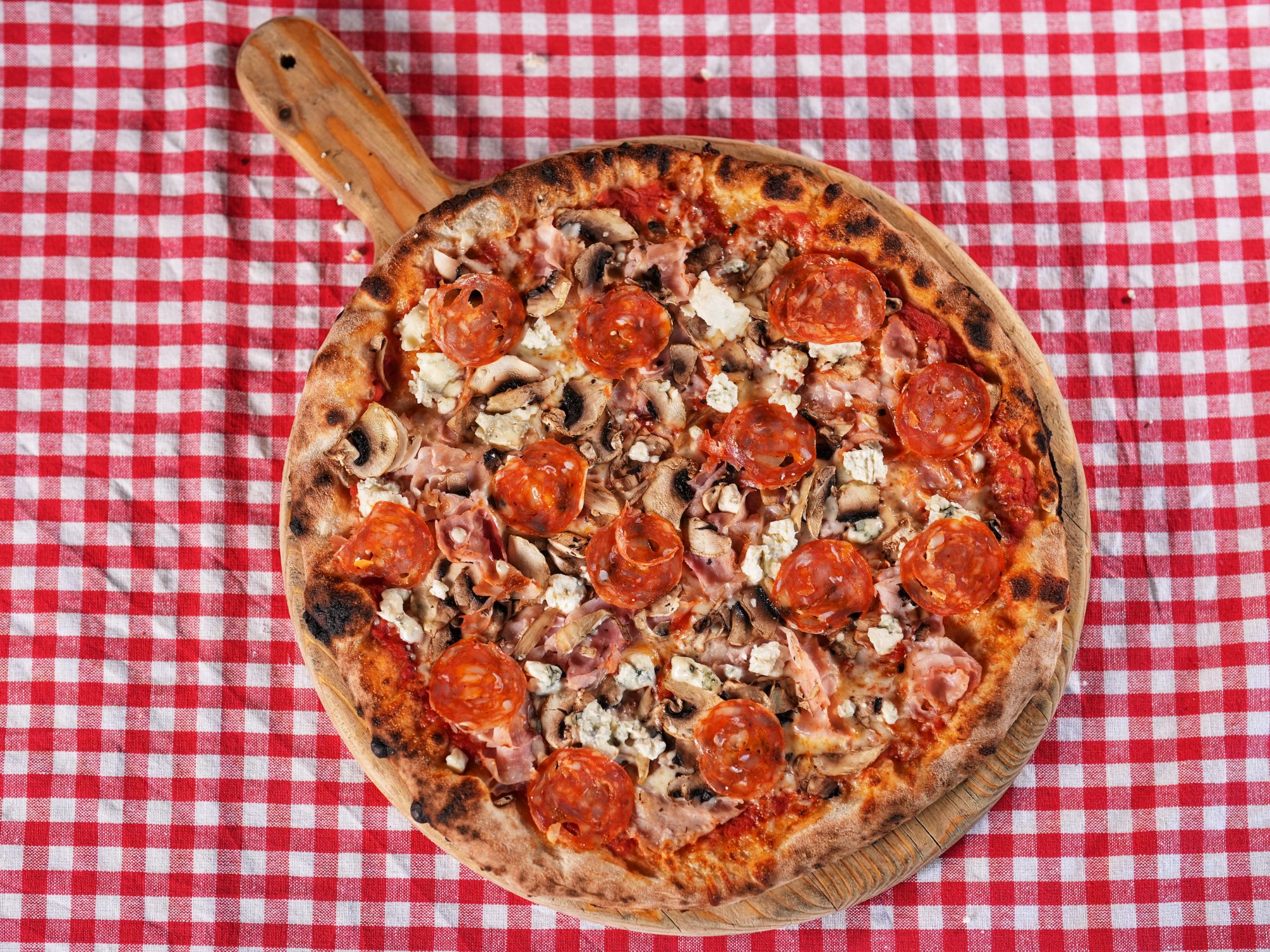 mozzarella 100g, sos roșii 100G, șuncă 80G, ciuperci 50G, gorgonzola 30G -