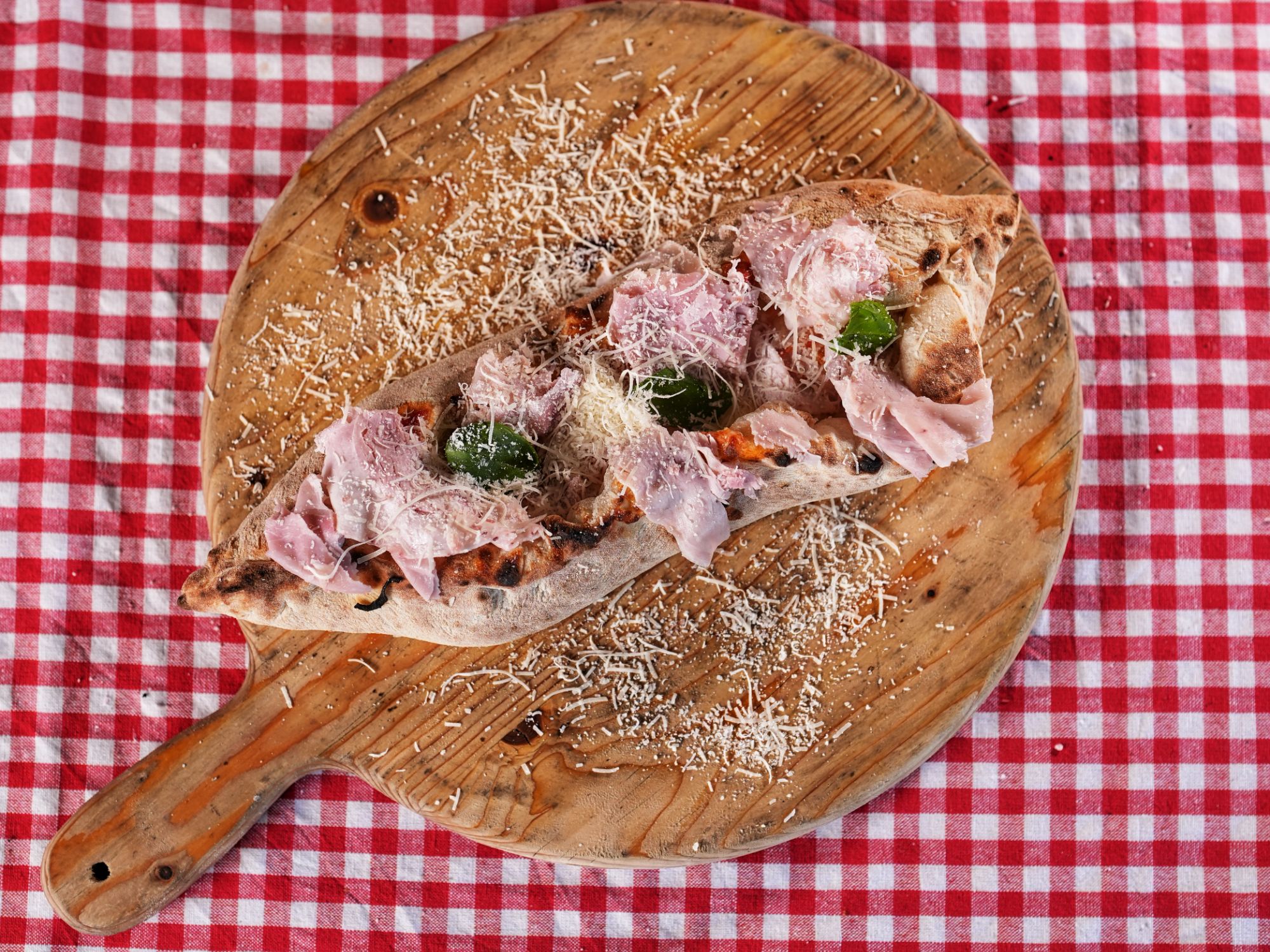 mozzarella 130g, șuncă 100g, sos roșii 50g, pesto cu busuioc 40g, parmezan 30g -