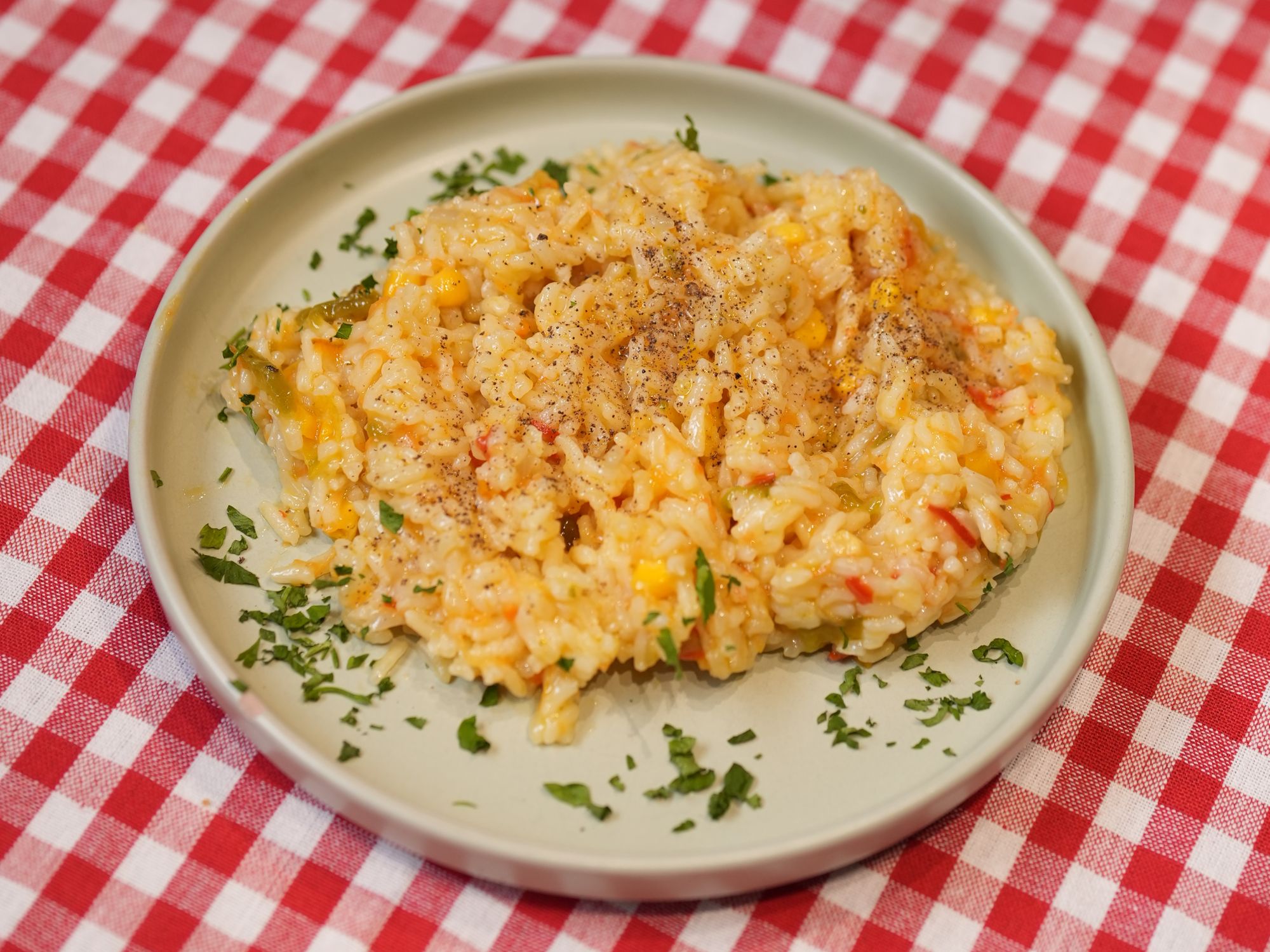 Orez cu legume 180g, piept de pui fâșii 150g, brânză dură 40g, sos de usturoi 30g, castraveti murati 60g, chiflă 60g -